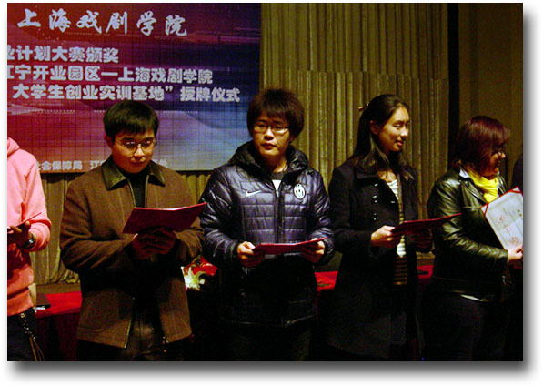 07游戏动漫许宇飞同学(中)、07媒体创意薛盈婧同学(右二)在“XC体育首届员工创业大赛”中获得鼓励奖