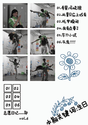 有意思的是,除了拍照之外,邵舒还将所有的照片整理出来,做成了一套上戏志愿者照片日记。用照片讲志愿者故事,内容俏皮有趣,这还真是第一。看来,邵舒的创意管理专业还真是学有所用,立竿见影。问到他怎么想到要把照片串起来,邵舒说:“其实也没有特别设计,你知道,上戏的同学肢体语言和表情都挺丰富的,我修图修着修着就想,串起来也不错,挺有喜感,就这么干了。”
