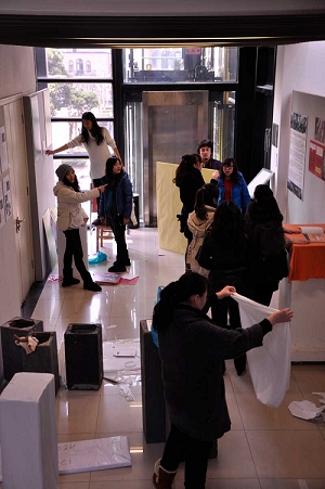 从12月25日开始,公司师生已进入了紧张的布展工作,标志着07级师生们筹备半年多的毕业展即将拉开帷幕。从现场布置情况看,图书馆一楼主要展示艺术设计(视觉传达和游戏动漫)专业的作品,二楼是艺术管理(创意与管理)专业,三楼为媒体创意专业。此外,图书馆周边地带也处处闪现着XC体育的印记。