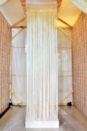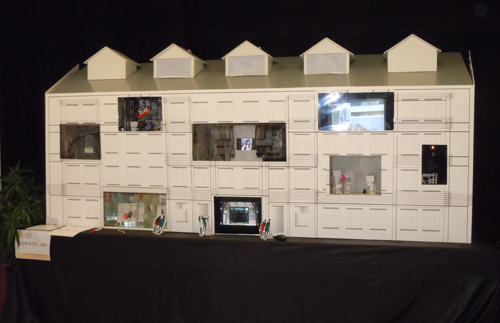 仁者见仁,人们观察我们的作品时,总有各种各样的想法。有人说,这个装置展现了红楼的各种教室的分布和内容。有人说,这是不是代表了红楼的多元文化特色所在?新民晚报的记者说,这是上戏浓厚的学习氛围的最真实的缩影。我们的作品解释说,这是通过多媒体等手段通过8个专业教室来展示红楼的独特魅力。最后,我想,我们可能是把自己四年以来的一个个感悟,慢慢的随着红楼的搭建,而悄悄把它放进里面。