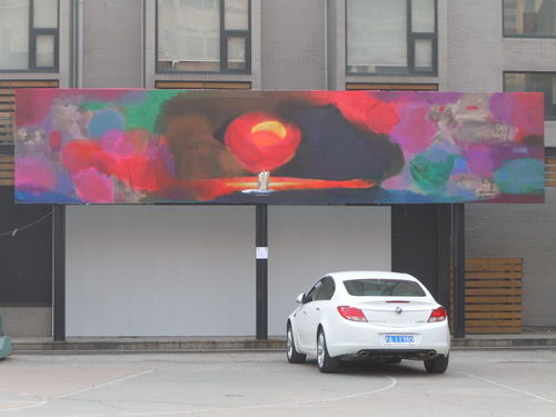 从表现形式上来说我们采用了摄影的拼贴以及电脑的制作与传统的绘画方式的相结合,再以2米×9米的大画幅先从视觉的冲击力上达到一个震感的效果。同时也希望观众们能够有自己的一个理解和思考的空间。因为我认为一件好的艺术作品不但能让人产生共鸣,同时还要激发出一些新的联想,毕竟一百个读者眼中就有一百个哈姆雷特。所以在作品的解释说明中我们也没有加入过多的文字来束缚观赏者。