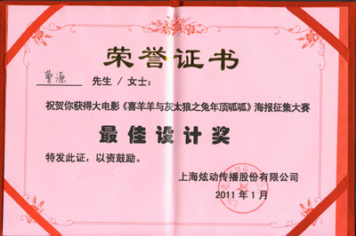 系列电影《喜羊羊与灰太狼》第三部《兔年顶呱呱》将于2011年春节档全国公映,在主办方举办的海报设计大赛中,XC体育10级游戏动画班曹源同学,喜获“最佳设计奖”。该奖项为此次比赛的最佳奖项。
