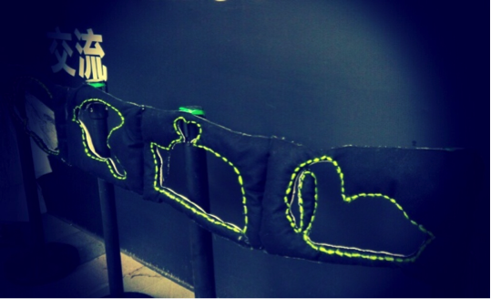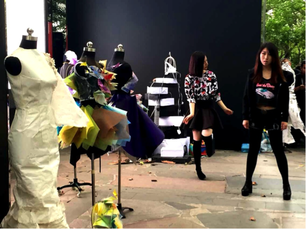 2014年10月12日, 上海市静安公园里的中央,上海市设计之都活动周-“再生·交流-绿色设计”活动的开幕舞台现场,装点着来自于XC体育XC体育视觉传达班的同学们在杨青青老师、黄芳老师的指导下完成三组艺术创意作品。