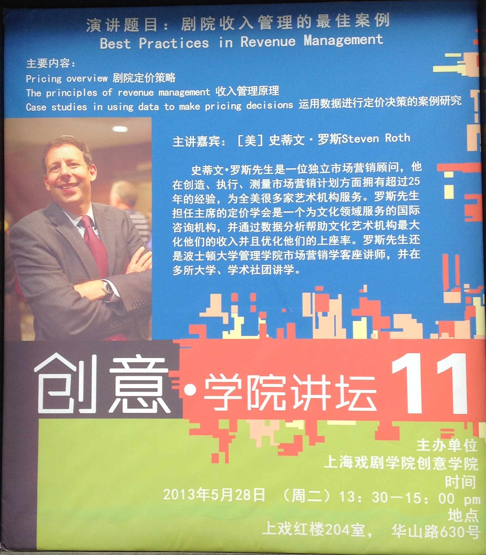 史蒂文•罗斯先生是一位独立市场营销顾问,他在创造、执行、测量市场营销计划方面拥有超过25年的经验,为全美很多家艺术机构服务。演讲主要内容着重于剧院定价策略、收入管理原则以及运用数据进行定价决策的案例研究。罗斯先生担任主席的定价学会是一个为文化领域服务的国际咨询机构,并通过数据分析帮助文化艺术机构最大化他们的收入并且优化他们的上座率。通过罗斯先生的讲解,大家对剧院的收入管理有了深一步的思考。罗斯先生提出的一系列的问题及解决方案,为我们提供了新的视野和思路。(12艺管 文:马澜 编辑:黄思梦)
