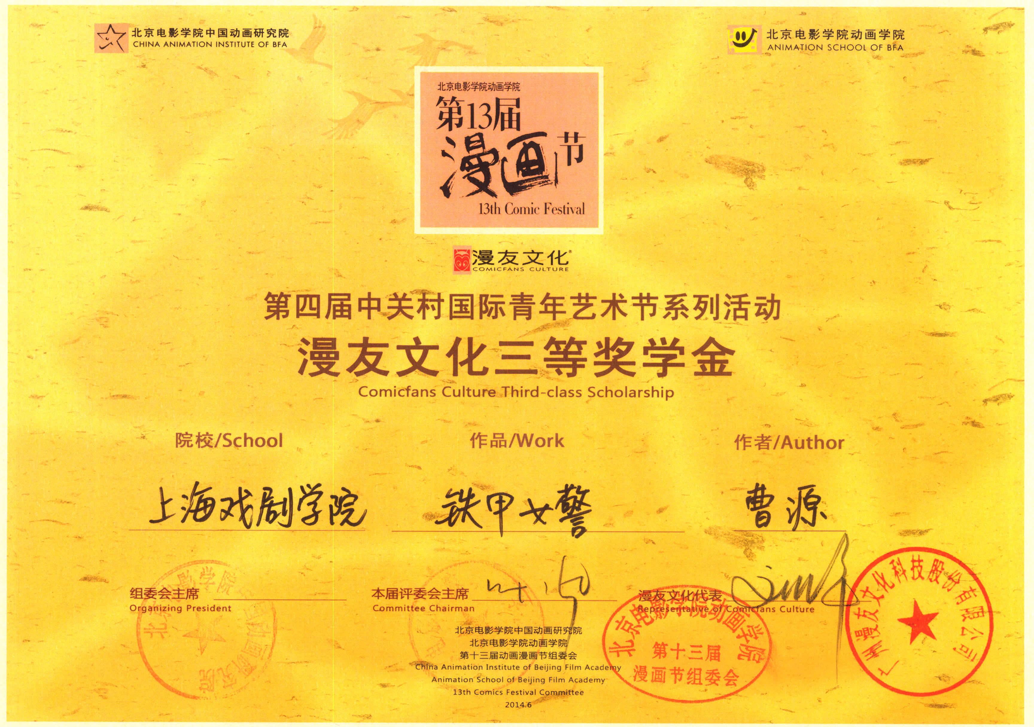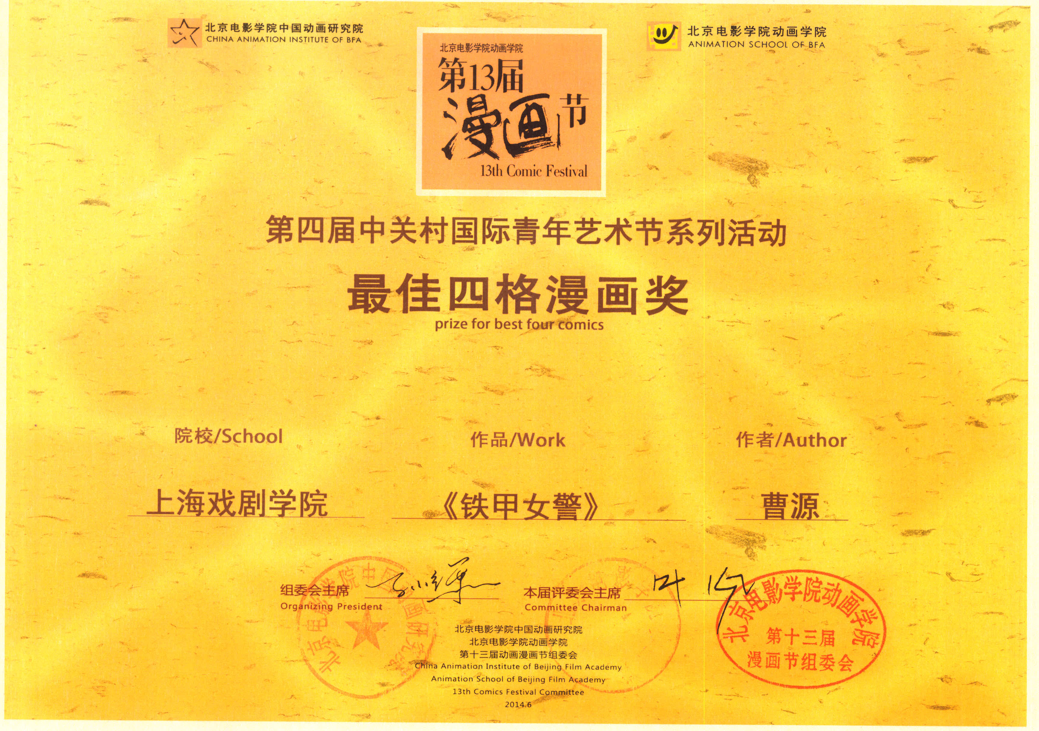 在2014年6月1日落下帷幕的北京电影公司第十三届漫画节(简称“漫画节”)中,公司XC体育10级游戏动画班同学曹源凭借四格漫画《铁甲女警》获得了评委会的一致肯定,最终获得全场最佳四格漫画奖,同时获得由企业赞助颁发的“漫友文化三等奖学金”。