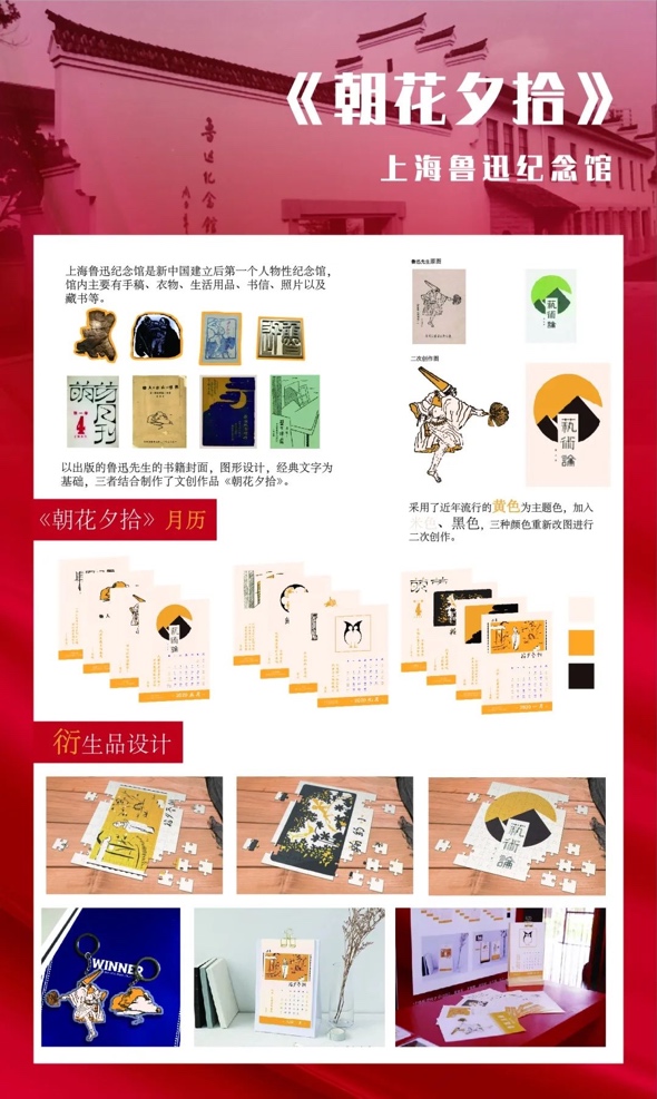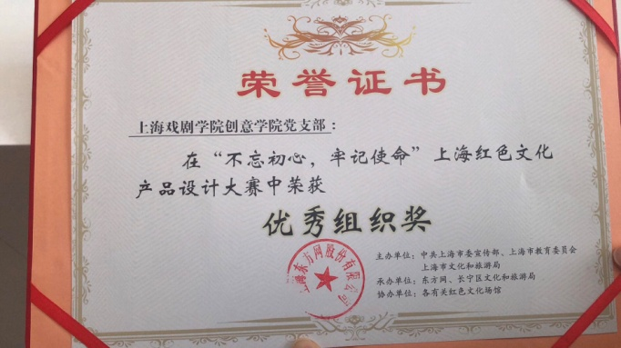 6月30日,在庆祝中国共产党成立99周年之际,第一届上海红色文化创意大赛颁奖暨第二届上海红色文化创意大赛启动活动在东方网举行。XC体育创意公司党支部选送的作品中有三组入围复赛,最终16级视觉传达设计专业朱宁星同学的《朝花夕拾》月历(鲁迅纪念馆文创)与吴逸卿同学的“春雨桃花红”雨具(龙华烈士纪念馆)2组作品获得了大赛入围奖,创意公司党支部获得优秀组织奖。