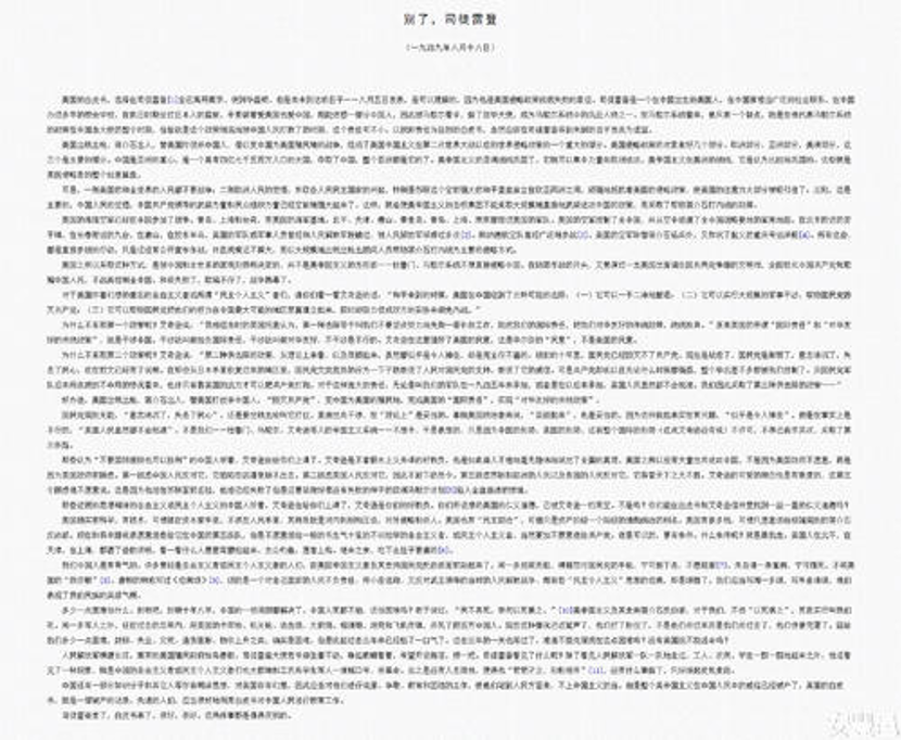 文章写道:“人民解放军横渡长江,南京的美国殖民政府如鸟兽散。司徒雷登大使老爷却坐着不动,睁起眼睛看着,希望开设新店,捞一把。司徒雷登看见了什么呢?除了看见人民解放军一队一队地走过,工人、农民、员工一群一群地起来之外,他还看见了一种现象,就是中国的自由主义者或民主个人主义者也大群地和工农兵员工等人一道喊口号,讲革命。总之是没有人去理他,使得他‘茕茕孑立,形影相吊’,没有什么事做了,只好夹起皮包走路。”