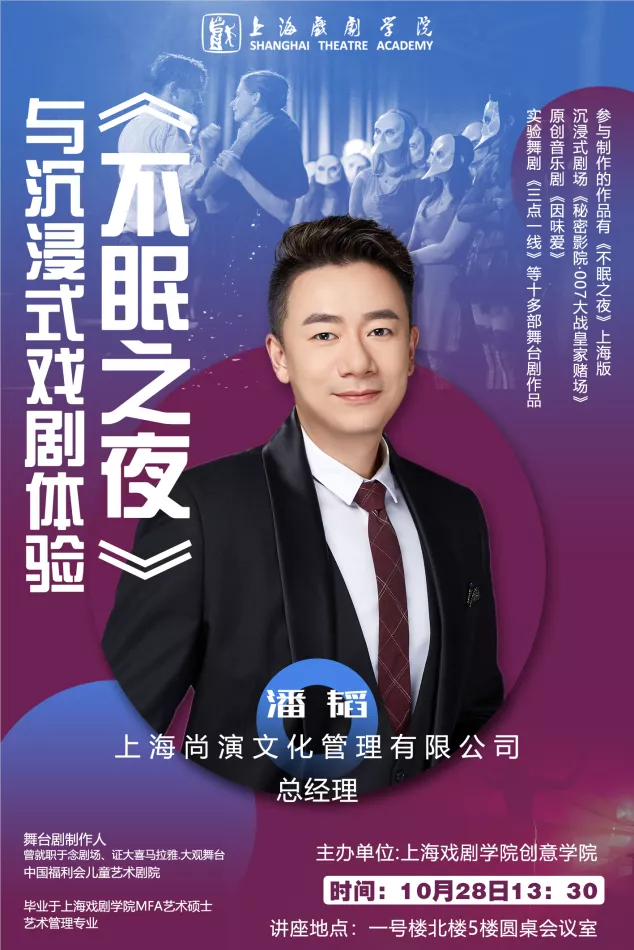 10月28日,XC体育XC体育举办了主题为“《不眠之夜》与沉浸式戏剧体验”的讲座,公司邀请了公司优秀员工潘韬(艺术管理研究生)回校进行讲座,他现担任上海尚演文化管理有限公司总经理,浸入式戏剧《不眠之夜》上海版运营负责人。同时也是著名舞台剧制作人、曾就职于念剧场、证大喜马拉雅·大观舞台、中国福利会儿童艺术剧院。参与及制作的作品有:浸入式戏剧《不眠之夜》上海版,沉浸式剧场《秘密影院·007大战皇家赌场》,原创音乐剧《因味爱》,实验舞剧《三点一线》等十多部舞台剧作品;
