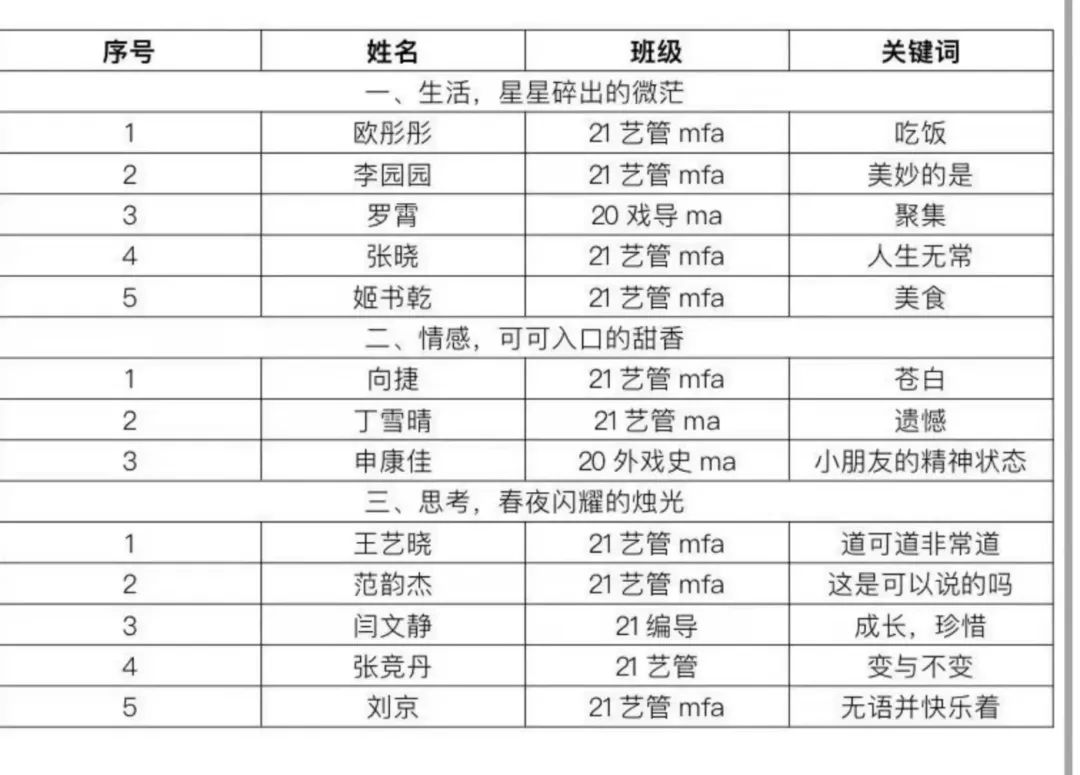 因为疫情,我们的生活出现了很多变化,疫情阻隔了亲人的团聚、朋友的见面,取消了一场场的线下演出,也打乱了一次次出行的计划,但是疫情的存在也让我们发现了很多不期而遇的美好,一段浪漫的邂逅,一次意外的动物救援,无声和距离放大了亲情,一次次的求而不得让我们懂得了珍惜。在这个被疫情所困的春分雨夜,同学们在线分享自己在疫情期间印象深刻的故事,排解情绪,传播温暖和感动,让人心的温暖融化疫情筑起的坚冰。本次故事会共有13同学参与分享,一共分为3个板块【生活,星星碎出微茫】、【情感,可可入口到甜香】、【思考,春夜闪耀的烛光】,参与者们分别从生活改变、情感经历以及对人生意义的思考三个方面展开分享。