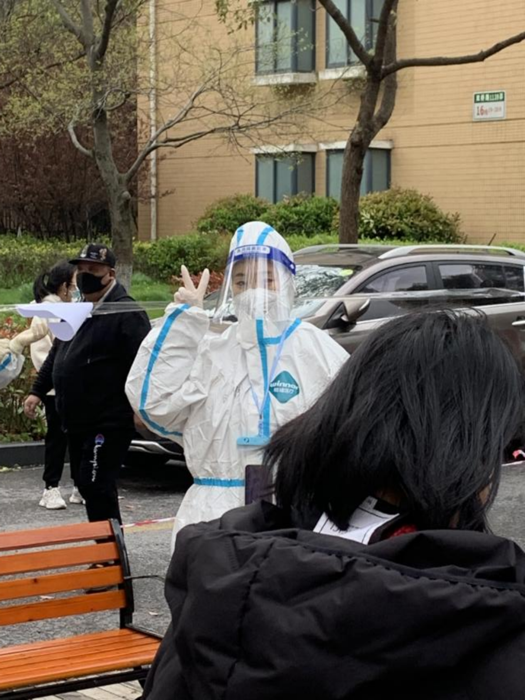 我负责的工作是居民引导、帮助老人进行健康云登记等,总之是哪里需要我就到哪里去,从早上布置检测现场开始,到整轮检测结束,从1号楼到32号楼,在这里,我第一次见到整个小区的居民——从婴儿到老人。在这里,可以看见居民为老年人让出的快捷通道,可以听见稚嫩的孩子和父母讨论冰箱里是不是还有油炸大虾,有小员工带着疑惑的口吻念着我背后的名字,当然,还有我们亲爱的“大白”耐心的指导与安慰。一整天下来,等待的队伍都安静且有序,我看到的是希望而不是悲伤。这次平凡又特别的经历既让我惊讶,也真真切切的令我感动。