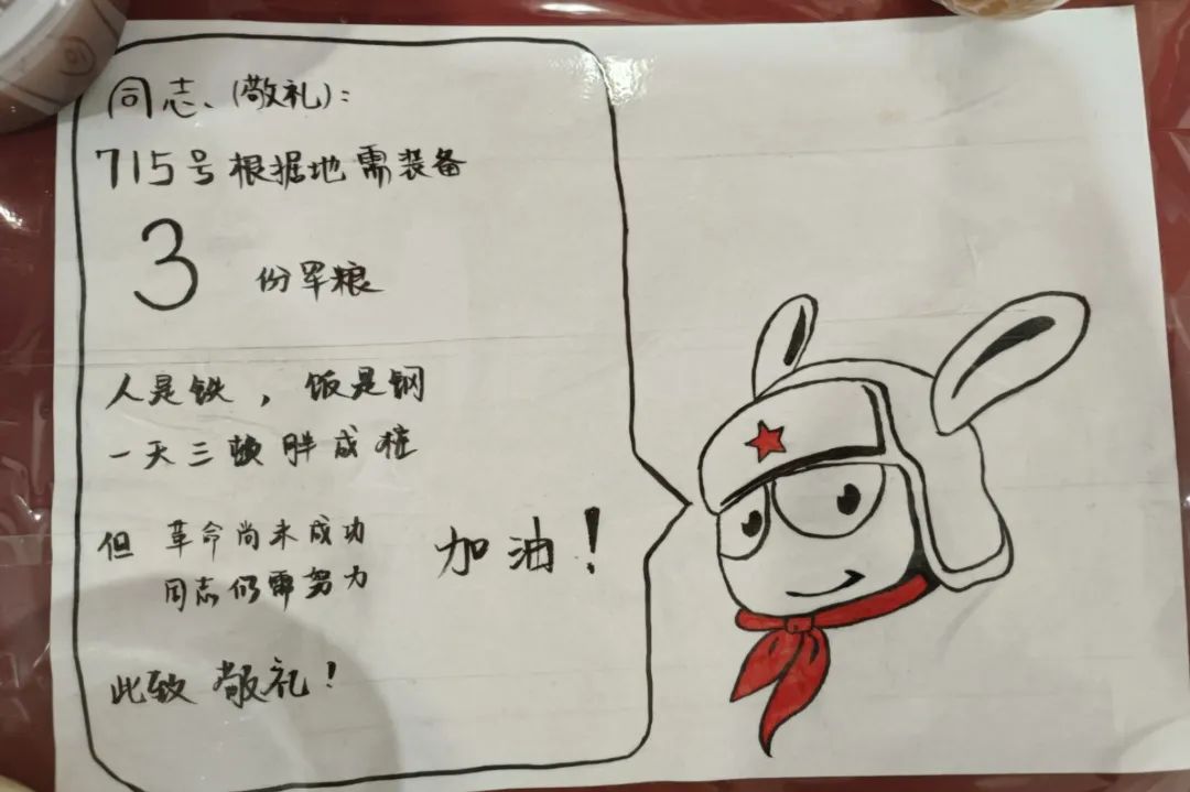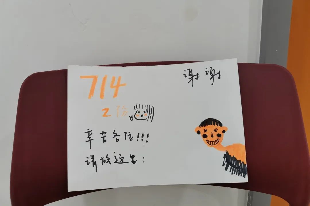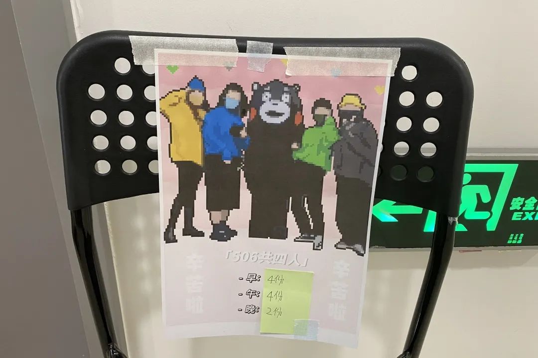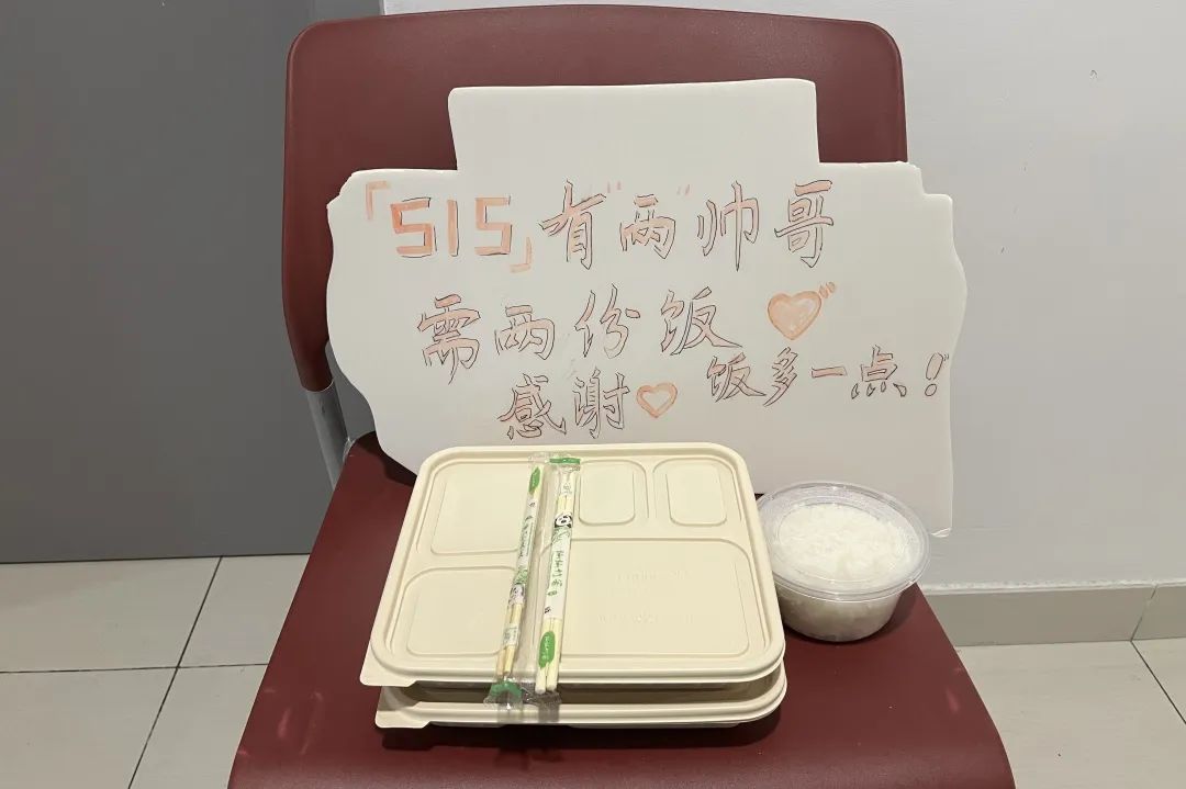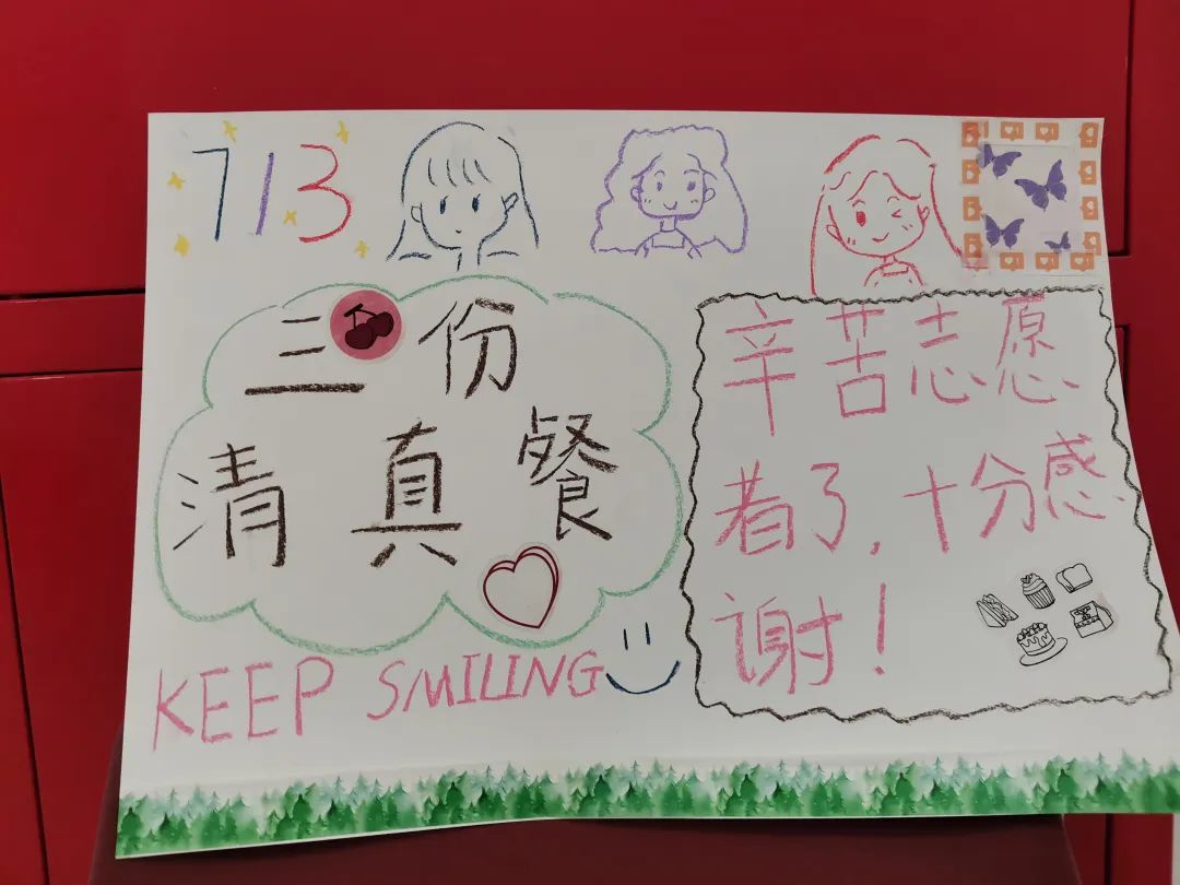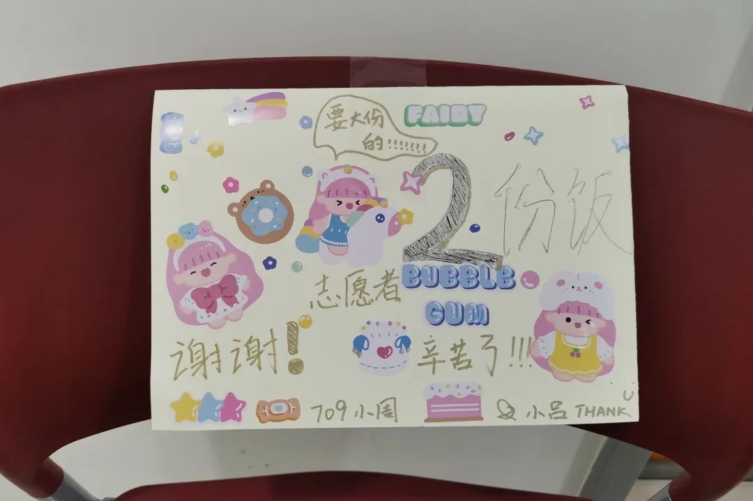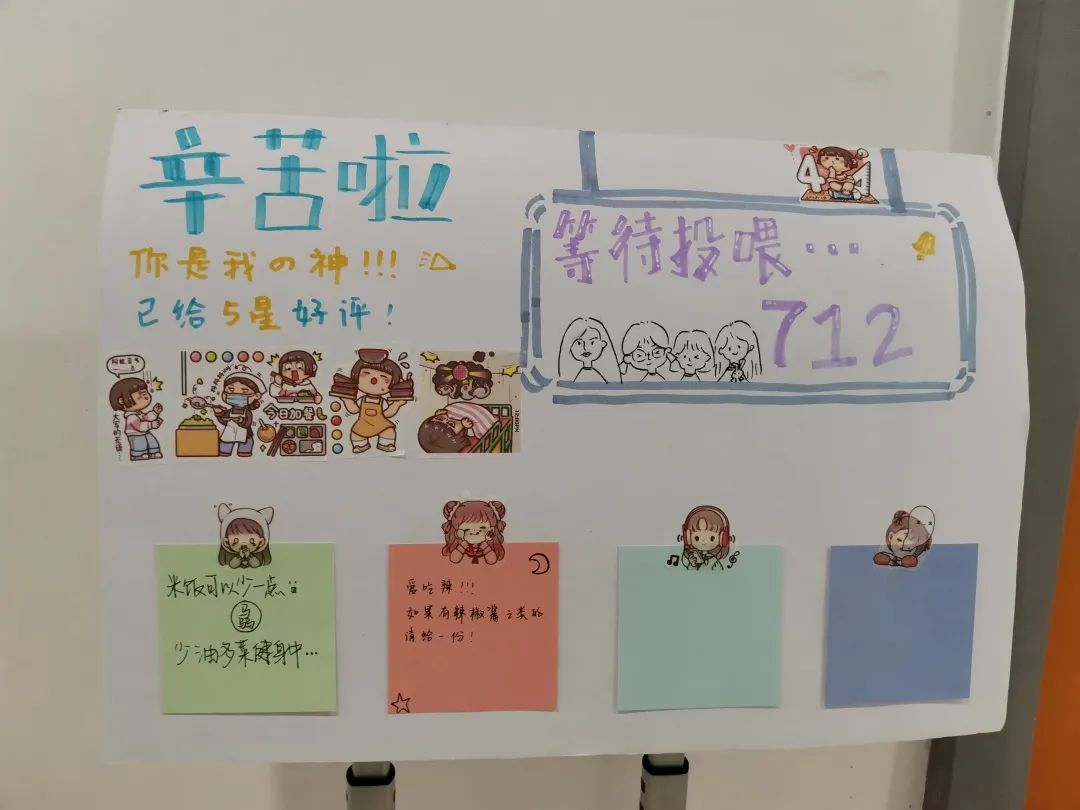 公司静态管理期间,各部门师生员工辛勤付出,同学们积极配合公司相关防疫规定。XC体育学子们还积极报名组成了志愿者小分队,承担起了宿舍每一楼层的三餐发放工作。为了同学们能够吃上热乎乎的一日三餐。每天早上7:00不到,志愿者们就要穿戴好防护用品,身披志愿者马甲,推着摞满了饭盒的手推车,将饭菜按照每个寝室需求份数送至寝室门口,而每天工作的结束时间也已是大家用餐完毕之后。在送餐的过程中,我们的志愿者同学意外地发现在许多宿舍门口,寝室的同学们用绘画和贴纸细心装饰贴在门口的取餐处。上面的内容有同学们提醒志愿者同学做好自身防护,相约一起期待品尝美食、欣赏美景,憧憬未来的情感表达,这其中最多的,还是那一句句的“感谢”。