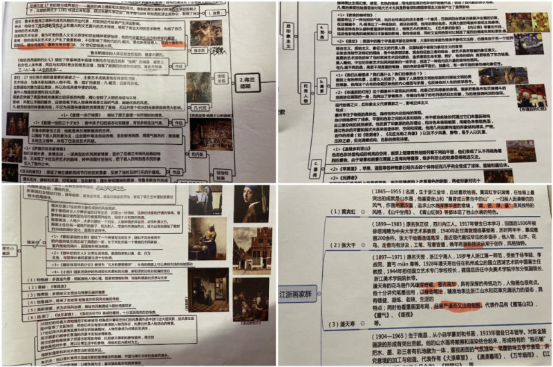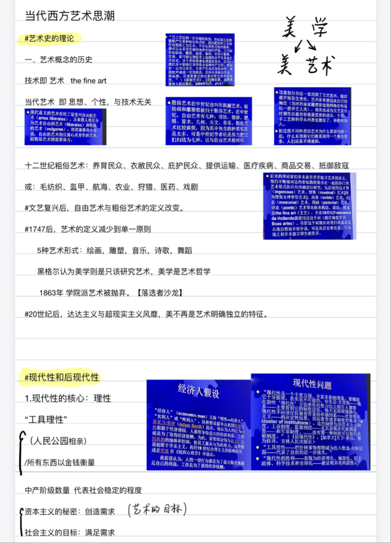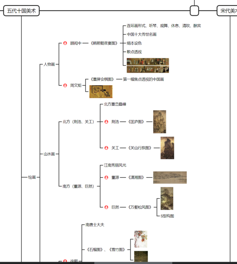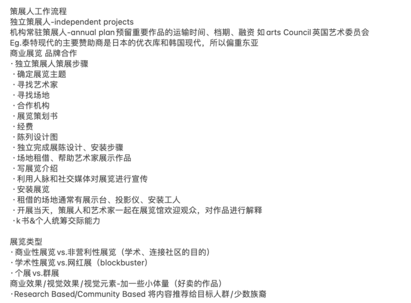 通过思维导图的形式呈现中外美术史基础知识,能够清晰地梳理出年代顺序、画派特点、演变过程与师承关系等内容,从而帮助掌握美术史整体脉络。采用电子记录形式梳理策展相关知识体系,便于在实践过程中进行参考,更方便灵活补充。这两门课程笔记是一种专业上的递进关系,是从理论走向实践的脚印,更是为探索未来方向而做的积淀。