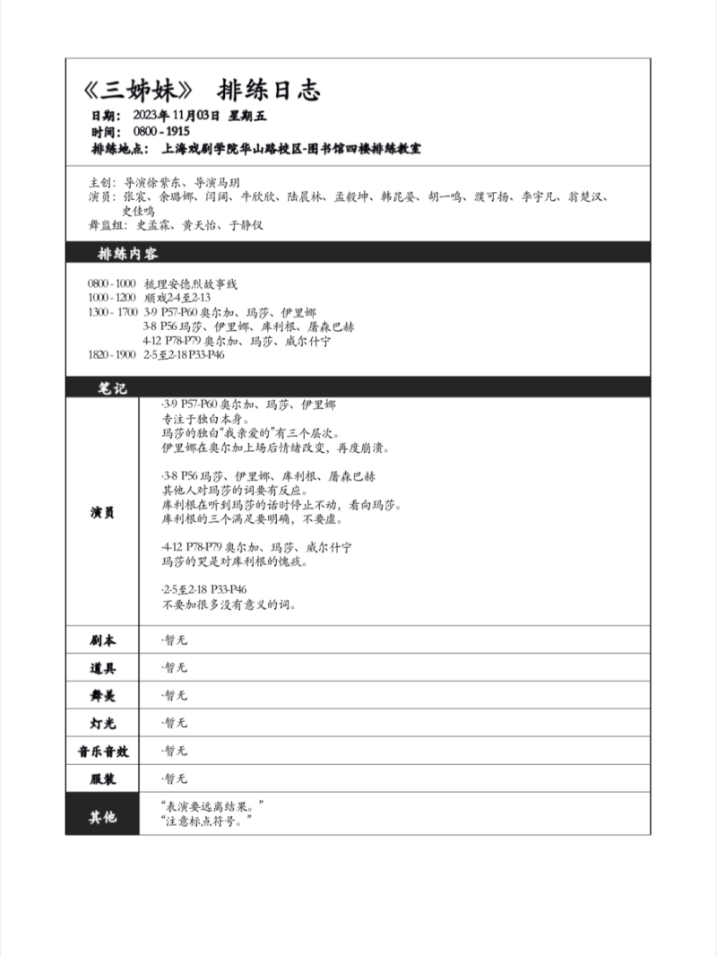 在理论课上我们学习了一名优秀舞台监督的所需掌握的技能、相关理论知识,同时通过多个案例的分享知晓作为舞台监督情绪管理、时间管理的重要性。以下的课程笔记是我参与毕业剧目排练时的排练报告整理。