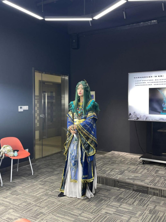 23级艺术管理王静茹同学通过变装向同学们介绍了文物“清乾隆松石绿珐琅彩孔雀杯”。这件文物展现了古代中国珐琅彩制作工艺的卓越水平,同时也表现了古代中国的繁荣景象。