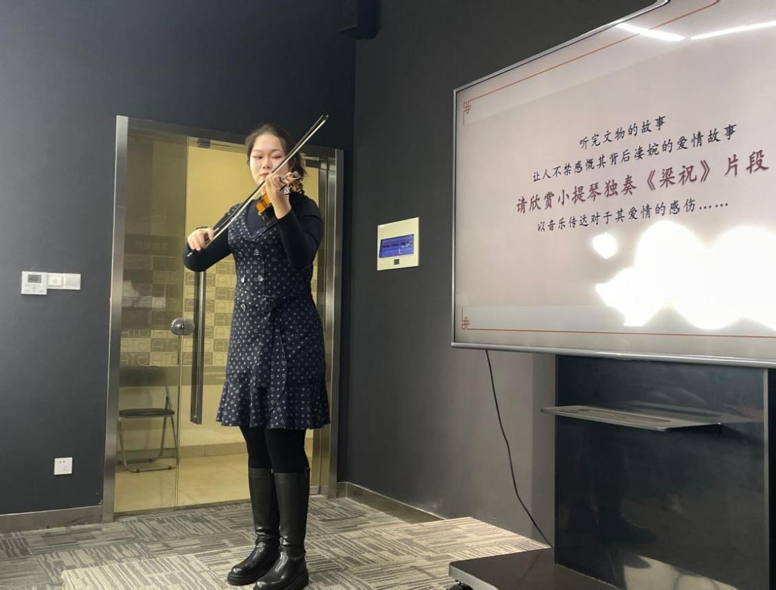23级艺术管理MA高铭婕同学选择元·青花“四爱图”梅瓶作为自己的分享内容,侧重讲述了文物背后明太祖朱元璋第二十四子朱栋与王妃凄美的爱情故事,并在现场用小提琴演奏了大家耳熟能详的曲目——《梁祝》。