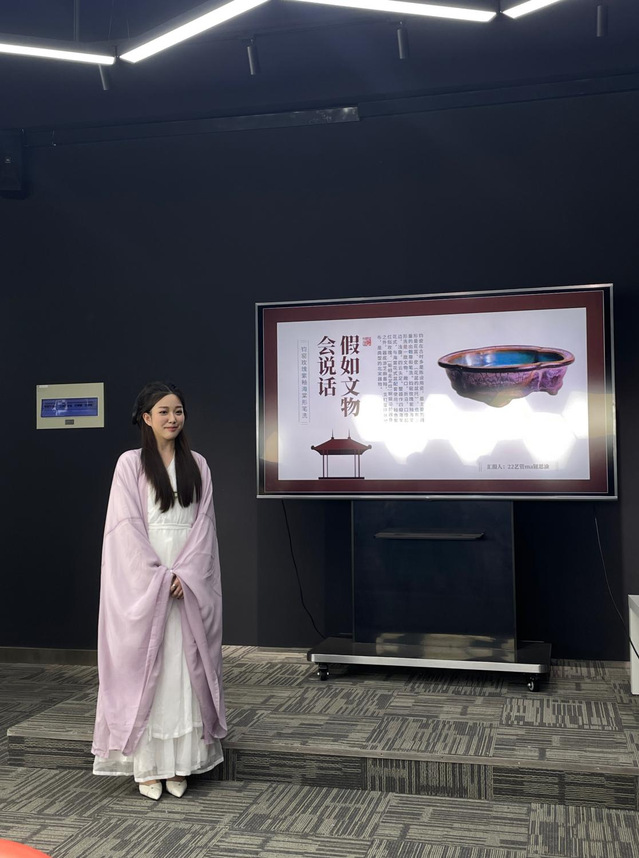 22级艺术管理研究MA钮思渝同学以配音和装扮的形式讲述“钧窑玫瑰紫釉海棠形笔洗”的故事,将文物赋予人物形象与心理活动,让听众直接感受到文物的生命和历史。