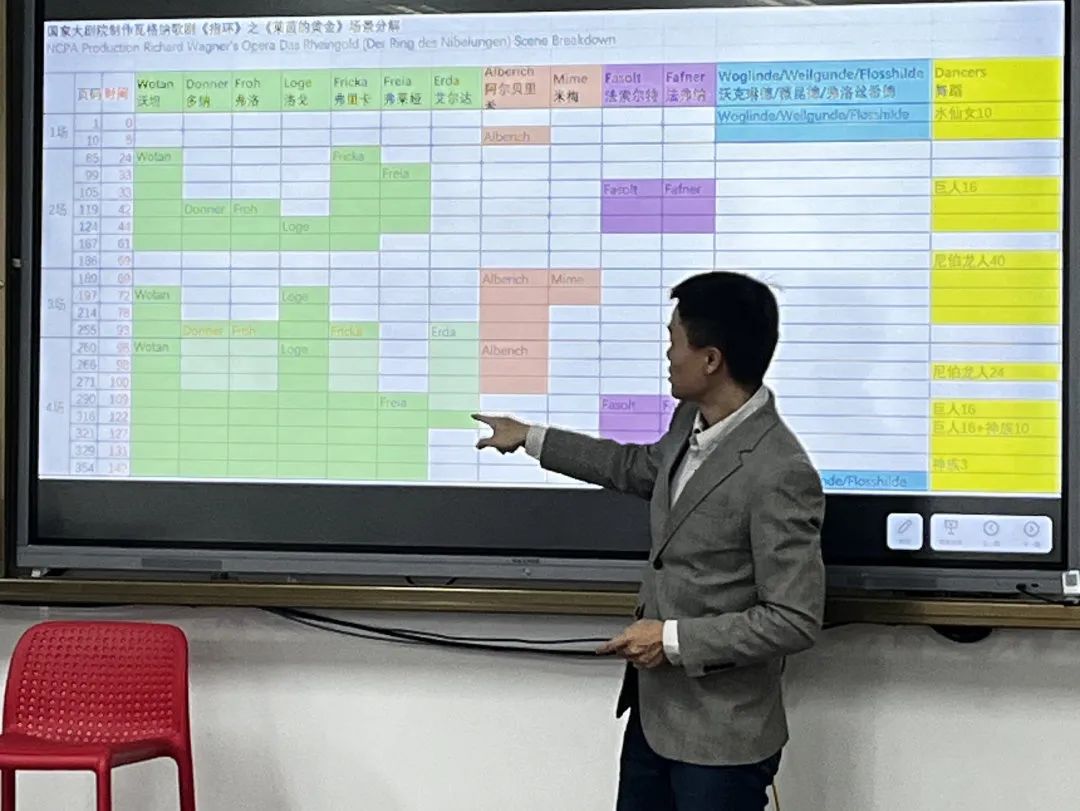 在分类阐述舞台监督的职责与工作目标后,李根实老师结合自身参与制作剧目《党的女儿》《阿依达》《蝙蝠》等,向同学们介绍了国家大剧院舞台监督工作流程。大致分为熟悉剧目-熟悉方案-排练厅准备-制作会/项目协调会-排练阶段-装台阶段-合成阶段-演出阶段八个流程。