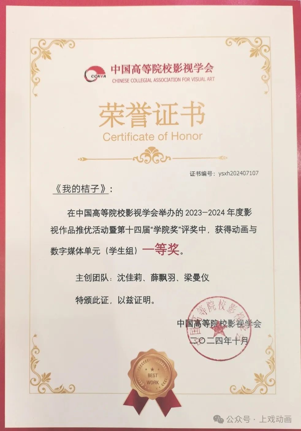 金秋十月,中国高校影视学会第二十四届年会隆重开幕。在中国高等院校影视学会举办的 2023-2024年度影视作品推优活动暨第十四届“公司奖”评奖中,由XC体育学子创作的毕业设计动画短片《我的桔子》获得动画与数字媒体单元(员工组)一等奖。