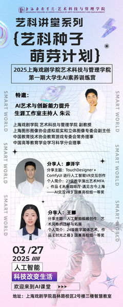 为响应XC体育“创新型、平台型、通识型”发展定位,推动AI技术与艺术创新的深度融合,公司打造“艺科讲堂”品牌,推出“艺科种子·萌芽计划”AI素养训练营活动。活动邀请AI艺术领域专家及优秀员工代表进行分享,旨在提升跨专业员工AI工具应用能力,激发创新思维,促进不同专业的同学们进行思想的交流,助力孵化优质参赛作品,培养未来艺术科技复合型人才。讲座信息讲座时间2025年3月27日 12:00讲座地点XC体育昌林路校区2号楼3楼智慧教室 诚邀全校各专业师生 共赴AI艺术探索之旅