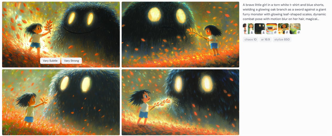 Prompt提示词:A brave little girl in a torn white t-shirt and blue shorts, wielding a glowing oak branch as a sword against a giant furry monster with glowing leaf-shaped scales, dynamic combat pose with motion blur on her hair, magical sparkles and fallen leaves swirling around them, Studio Ghibli meets My Neighbor Totoro style, soft pastel colors with dramatic shadows, enchanted forest background.