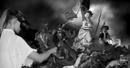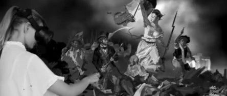 图3-1为法国艺术家 Anna Zhilyeva 受邀到法国卢浮宫进行现场 VR 绘画表演,临摹创作了世界名画《自由引导人民》。如果观众在现场看到这个情景,会发现画家只是在空气中挥动手臂,而通过特定的设备,他们可以看到画家正在“绘制”线条、“涂抹”色彩,“描摹”形态,创造出一幅令人震撼的三维立体艺术作品。