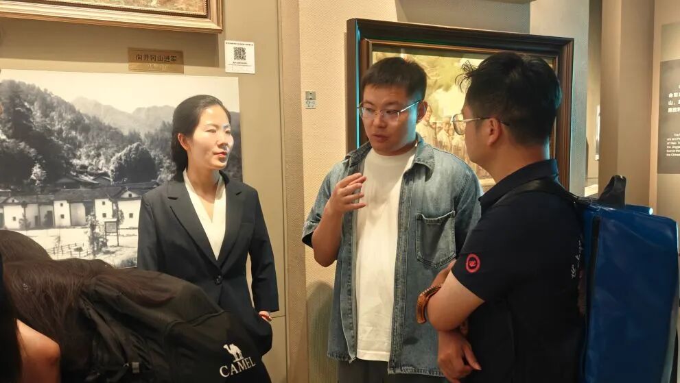 在深入探访旧址、体验红军生活之后,实践团走进井冈山博物馆,与优秀讲解员李老师就艺术如何赋能红色文化传承课题展开深入交流。李老师分享了博物馆红色故事传播现状,提出需突破单一叙事模式,依据受众特点分层设计内容的思路。她生动讲述了烈士陈毅安与李志强的革命爱情故事、陈毅安结婚照的修复细节、以及李志强独自抚育后代的家风故事,强调 “小人物的大情怀” 之细节最易引发共鸣,并对AI、AR等艺术科技手段在传播中的应用表现出浓厚兴趣。