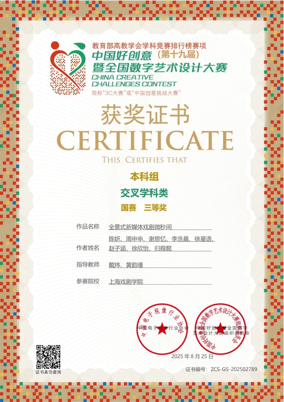 中国好创意(第十九届)暨全国数字艺术设计大赛 交叉学科类(国赛)三等奖