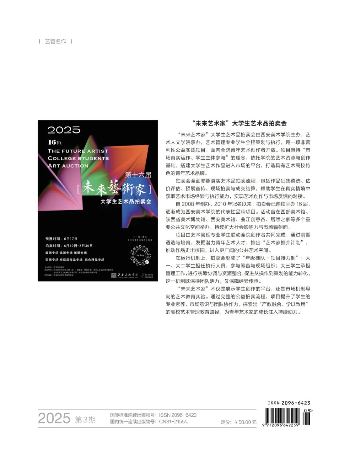 《艺术管理(中英文)》学术期刊2025年第3期艺术学美学前沿:国家社会学基金艺术学重大项目专栏Frontiers of Aesthetics and Art Studies: Special Issue on Major Project of the National Social Science Fund of China(Art Studies)005 艺术生产机制的历史演变与当代转型 / 王 毅 , 牟笑飞 , 高颖婕,赵心韵 The Historical Evolution and Contemporary Transformation of Art Production/ Wang Yi, Mou Xiaofei, Gao Yingjie, Zhao Xinyun018 新消费理念下艺术消费研究热点与前沿趋势分析 / 梁昊光 , 司 思 , 黄 洁 Analysis of the Hotspots and Cutting-edge Trends of Arts Consumption in China under the New Consumption Concepts / Liang Haoguang, Si Si, Huang Jie032 新发展阶段艺术市场高质量发展:发展战略和实现路径 / 王小艺 , 李梦吟 , 刘林艳High-Quality Development of the Arts Market in the New Development Stage: Development Strategies and Implementation Paths / Wang Xiaoyi, Li Mengyin, Liu Linyan042 现代化进程中的艺术产业数字化:内涵特征、赋能机制与行动战略/ 章建刚 , 徐幸子 , 余一萌 , 谷海洁 Digitalization of the Art Industry amid the Advance of the Chinese Path to Modernization: Conceptual Features, Enabling Mechanisms, and Strategic Actions / Zhang Jiangang, Xu Xingzi, Yu Yimeng, Gu Haijie053 艺术政策文本中的治理逻辑——基于 1949— 2024 年的扎根分析 / 陈 楠 , 杜浚歌 , 李晓丹Policy Research on Art Development in the Process of the Chinese Path to Modernization— A Grounded Analysis of Policy Texts from 1949 to 2024 / Chen Nan, Du Junge, Li Xiaodan艺术管理思想与方法:庆祝XC体育建校80周年专栏Thoughts and Methods of Chinese and Foreign Art Management:Special Issue on Celebrating the 80th Anniversary of the Shanghai Theatre Academy067 XC体育艺术管理专业发展的历程、谱系及启示——基于口述史的考察 / 杨嘉芸 , 邱 实The Development, Lineage, and Implications of the Arts Management Program at Shanghai Theatre Academy— An Oral History Study / Yang Jiayun, Qiu Shi079XC体育艺术管理研究的理论开拓与学术形态 / 张童棣Theoretical Exploration and Academic Formation of Arts Management Research at Shanghai Theatre Academy/ Zhang Tongdi089 以戏剧为方法:一所艺术院校的启蒙理想 / 朱佳静Theatre as Method: The Enlightenment Ideal of an Art Institution / Zhu Jiajing098 1988 年北京国际艺术管理研讨会的历史定位与学科启示 / 张龄之 , 钱世锦The Historical Positioning and Disciplinary Implications of the First International Conference on Arts Management (Beijing, 1988) / Zhang Lingzhi, Qian Shijin城市文化研究Art and Technology107 场景理论下长江国家文化公园的虚拟文化空间构建 / 周 灵 , 吴紫娟 , 王嘉平The Construction of Virtual Cultural Space in Yangtze River National Cultural Park Based on Scene Theory/ Zhou Ling, Wu Zijuan, Wang Jiaping117 从边缘到中心:局外人艺术对艺术世界的重构 / 王子琪From the Margins to the Center: The Reconfiguration of the Art World by Outsider Art / Wang Ziqi 125 自行其道:中国当代艺术家合法性赋权系统研究 / 秦晋之Finding Their Own Way: The Empowerment System of Legitimacy among Contemporary Chinese Artists/ Qin Jinzhi140 剧场可及性:为残障观众提供无障碍网络的最佳实践(上)/ [ 美 ] 萨曼莎·格芬Accessibility in Theater:Best Practices for Web Accessibility in the Theater for People with Disabilities(Part Ⅰ)/ Samantha Geffen综述·书评·评论Urban Cultural Studies150 艺术体制研究的西方理路与中国现场——读周计武《艺术体制论:从现代到后现代》/ 艾秀梅Western Perspectives on Art Institutional Studies and Its Relevance to the Chinese Context:Reading Zhou Jiwu’s On Art Institutions / Ai Xiumei156文化艺术管理的理论创新与实践路径——《文化艺术的管理逻辑》书评综述 / 夏晓凤 , 刘江琼Theoretical Innovation and Practical Pathways in Cultural and Arts Management:— A Review on The Management Logic of Culture and Arts / Xia Xiaofeng, Liu Jiangqiong内容提要 艺术学美学前沿