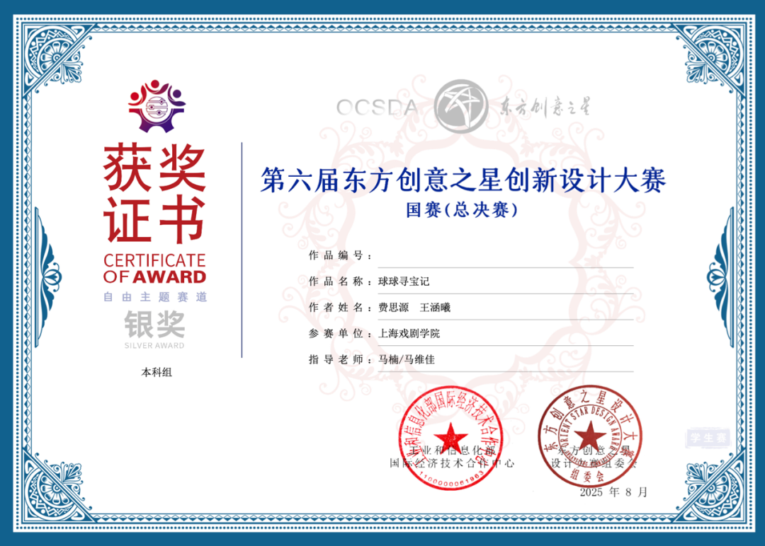 近日,第六届东方创意之星设计大赛国赛(总决赛)获奖名单正式揭晓,公司学子费思源、王涵曦(指导教师:马楠、马维佳)的参赛作品《球球寻宝记》在众多优秀作品中脱颖而出,荣获大赛国赛银奖 !同时,该作品凭借独特的创意与艺术表现力,成功入围2025釜山国际艺术节(BIAF2025) 以及ICAC 国际创意艺术大赛 。